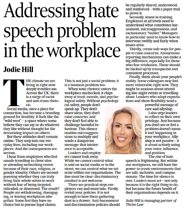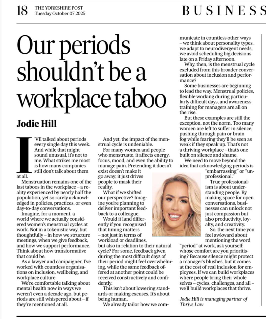 Jodie Hill, Managing Partner at Thrive Law, challenges recent criticisms of remote working in this Yorkshire Post article. She highlights the positive impact of flexible working on productivity, wellbeing, and inclusion, emphasizing its vital role in supporting neurodivergent individuals, carers, and working parents.