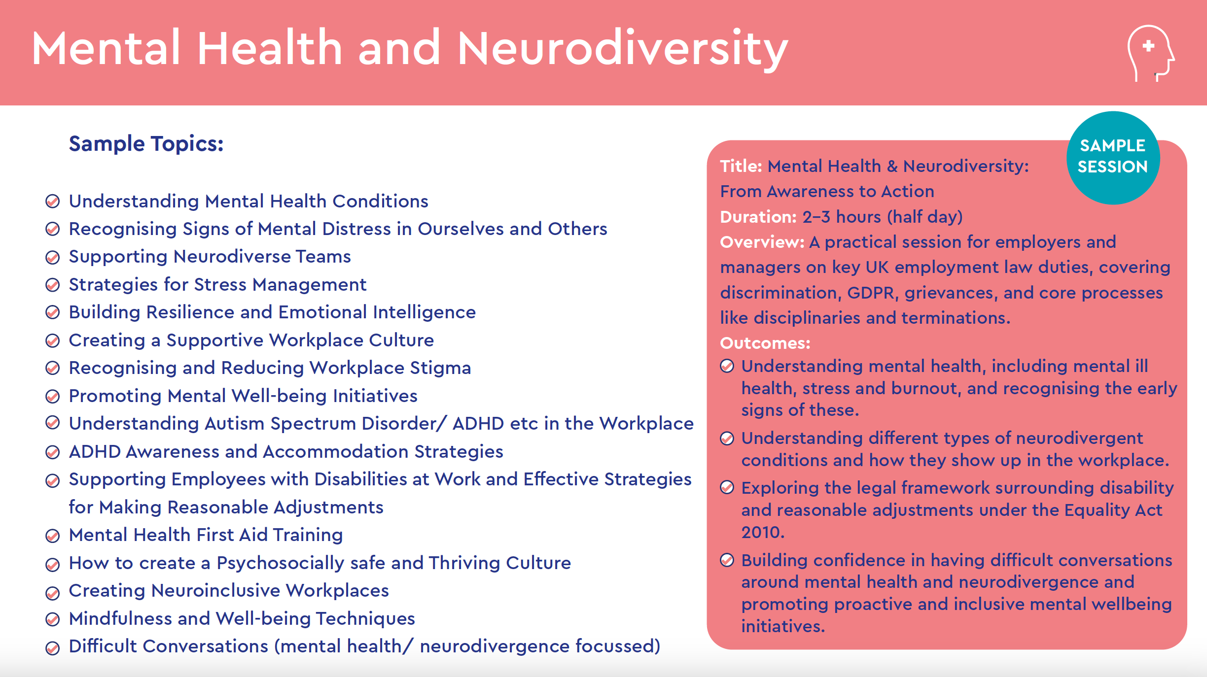 Our “Train the Trainer” programme equips experienced managers and leaders with the skills, confidence and legal insight needed to deliver compelling, inclusive training across your organisation. Guided by our expert employment law solicitors who are passionate about mental health, ED&I and neurodiversity.