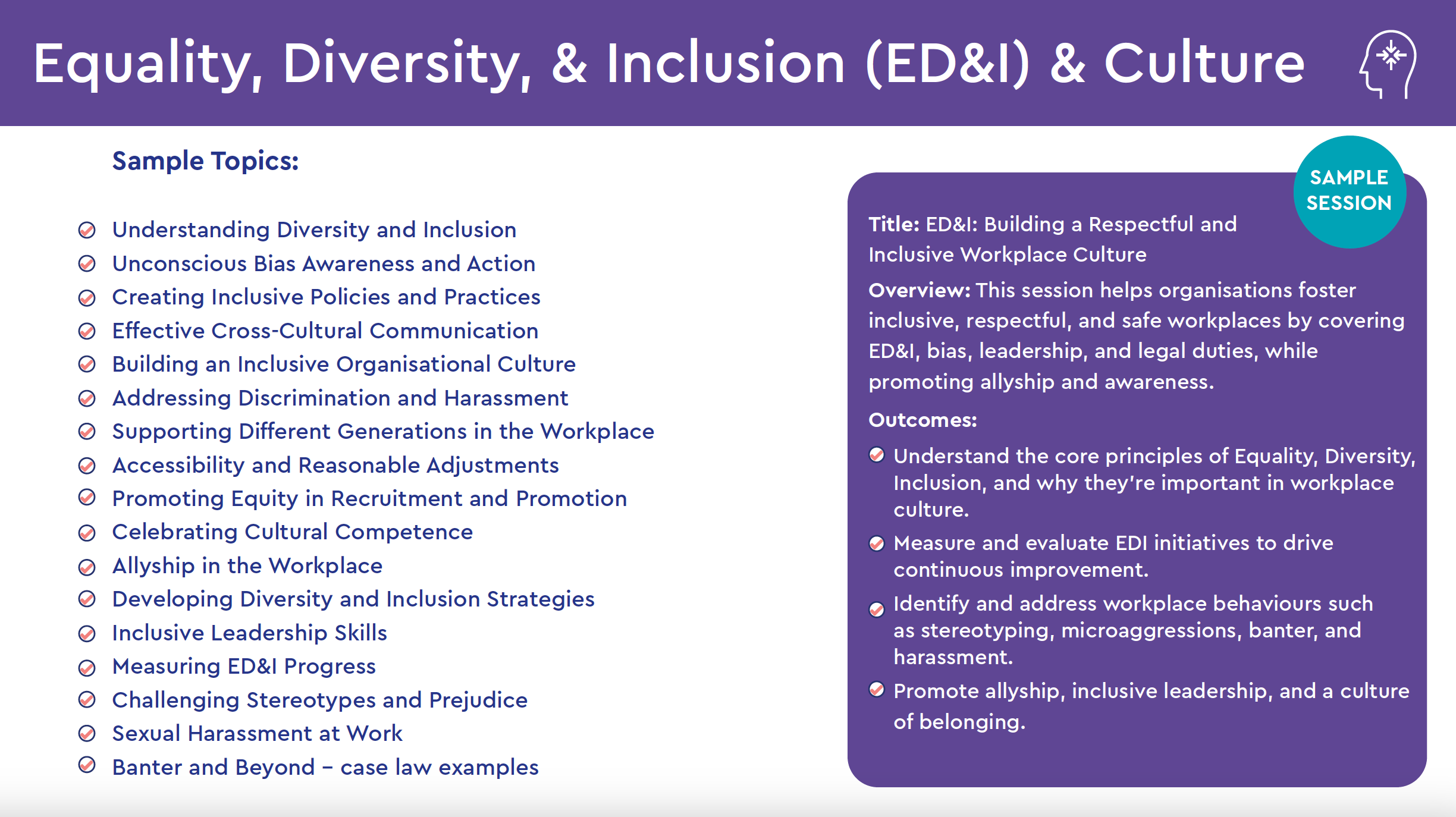 Through our bespoke programmes, we support leaders, managers, and staff teams with a powerful blend of expert legal insight, ED&I expertise, and the invaluable power of lived experience.